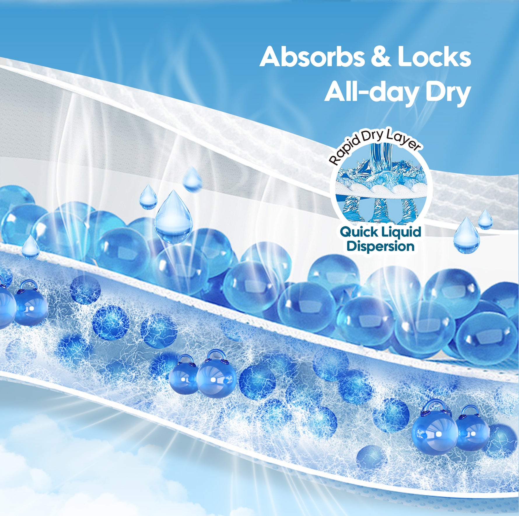 İkiqat udma qabiliyyətinə malik nüvə nəmi effektiv şəkildə udur və saxlayır, sizi hər zaman quru saxlayır. Onun MicroAiry Film™ arxa təbəqəsi nəfəs alma qabiliyyətini artırır, 50% daha çox nəfəs alma qabiliyyəti və milyardlarla mikro məsamə ilə quru və təravətli bir hiss təqdim edir.