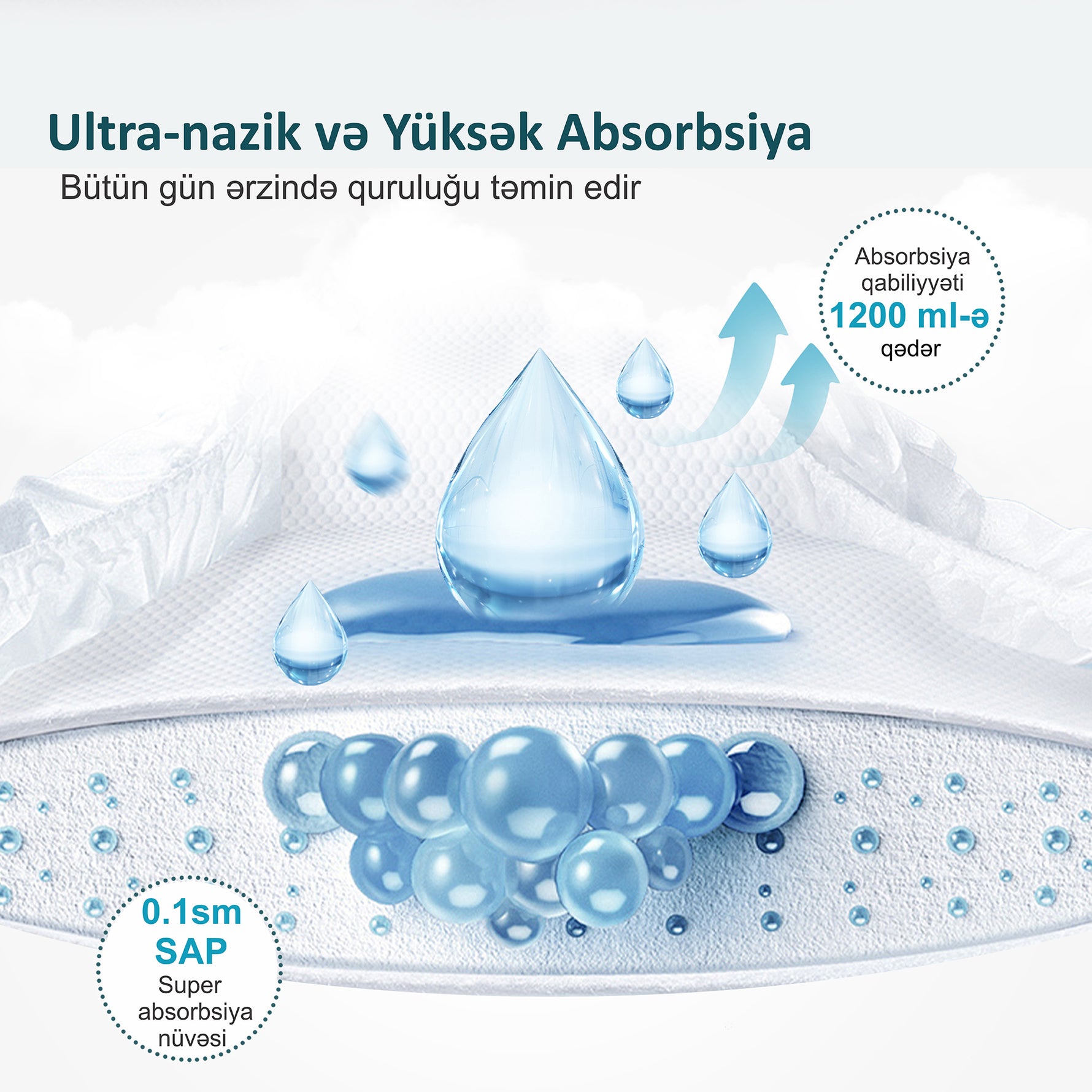 Ultra nazik uşaq bezləri və tuman-bezlərimizlə son dərəcə rahatlıq və qorunma təcrübəsini yaşayın. 2 mm-lik Ultra-Nazik Absorbent Core™ xüsusiyyətinə malik olan bu məhsullar nəfəs ala bilən və yüngül olmaq üçün nəzərdə tutulmuşdur, yığılmanın qarşısını alır, eyni zamanda ardıcıl performans təmin edir. Yenilikçi MicroAiry™  Film körpənizin dərisini təravətli və quru saxlayaraq optimal hava axınına imkan verir . Nəfəs alma qabiliyyətini 30% artıran Comfort Fit Waistband™  və 3D İnci Naxışlı Üst təbəqə ilə körpəniz bütün gün rahatlıqdan zövq alır. İkiqat sızma qoruyucuları, tez quruyan təbəqə və rahat nəmlik göstəricisi ilə təchiz olunmuş bu uşaq bezləri həssas dəridə yumşaq qalaraq etibarlı qoruma təmin edir.