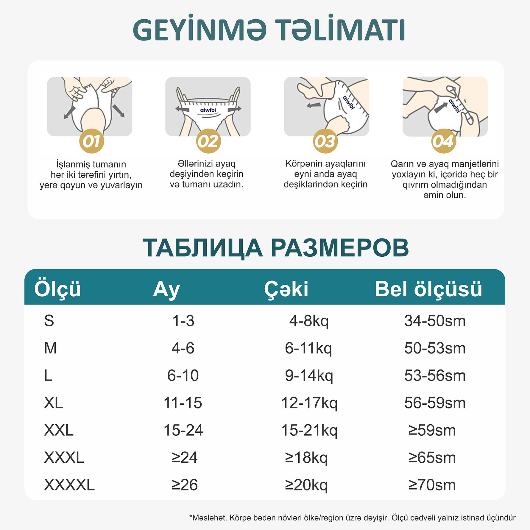 • Uşaq bezi qablaşdırmasında çəki diapazonu sadəcə bir bələdçidir. Əgər uşaq bezi çox böyükdürsə, sızmalara səbəb ola bilər. Məsələn, uşaq bezi körpənizin budlarına möhkəm otura bilər, ancaq paça nahiyəsində boşluq varsa, sidik kifayət qədər tez udulmayacaq.