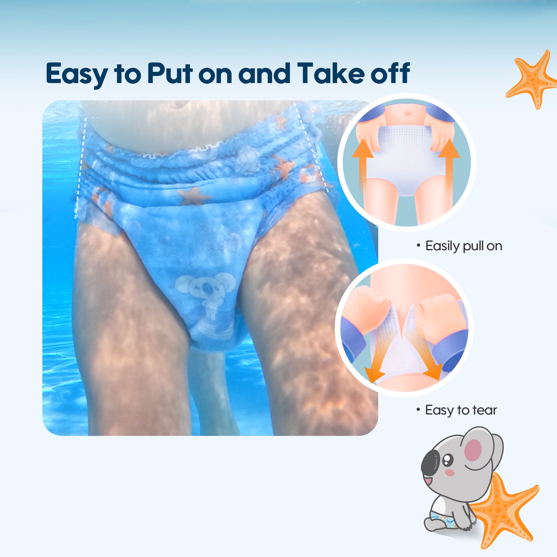 Aiwibi Körpə Üzgüçülük Şalvarları rahatlıq üçün hazırlanmışdır. Onları geyinmək və çıxarmaq asandır, bu da uşaq bezlərinin dəyişdirilməsini hətta oyun zamanı belə tez və problemsiz edir.