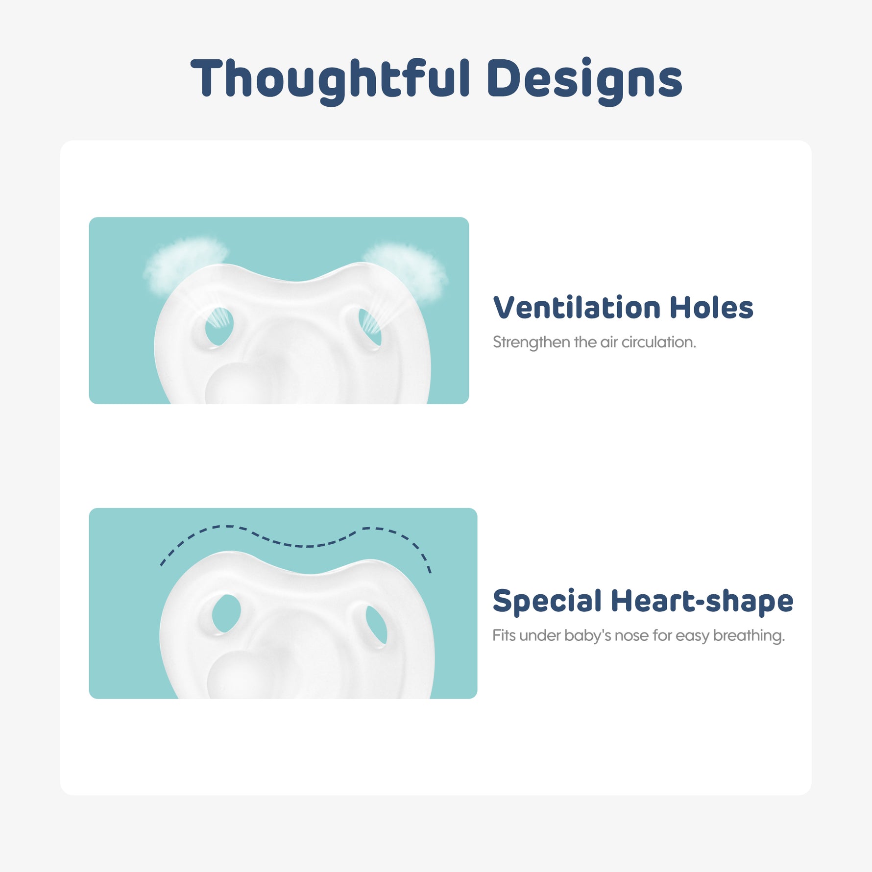 Bəli, əmzikdə hava axınını təşviq edən və asanlıqla nəfəs almaq üçün burun altına uyğunlaşdırılaraq körpənizin rahat qalmasına kömək edən ventilyasiya dəlikləri var.