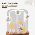 Cleaning is super easy! You can wash the bottles by hand with warm soapy water, or pop them in the top rack of your dishwasher. They're also safe for sterilizers and boiling water to keep everything germ-free.
